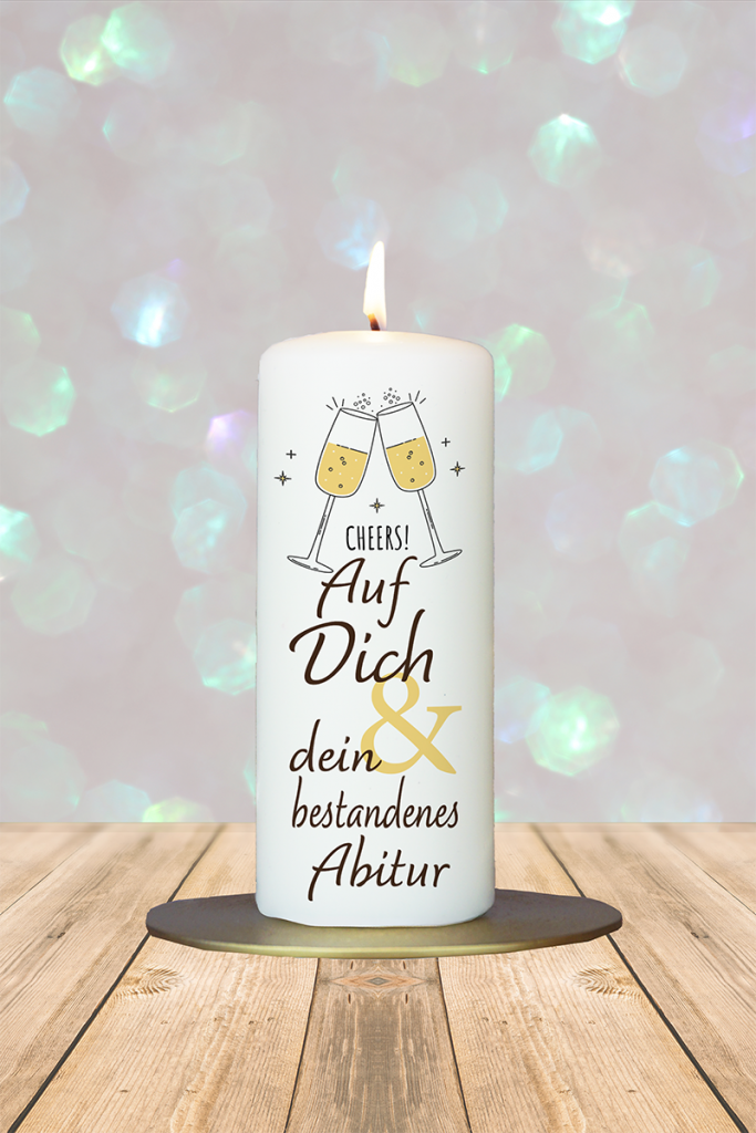 Feier den besonderen Moment des bestandenen Abiturs mit unserer festlichen Kerze „Cheers – Auf Dich und dein bestandenes Abitur“. Diese fröhlich gestaltete Kerze zeigt zwei elegante Sektgläser, die anstoßen, und dazwischen prangt das Wort „Cheers“ in einem einladenden Schriftzug. Dieses Design verkörpert die Freude und den Stolz über den erreichten Meilenstein und lädt zum Feiern ein. Unter den Gläsern steht der herzliche Text „Auf Dich & dein bestandenes Abitur“, der die Wertschätzung für die harte Arbeit und den Einsatz des Absolventen zum Ausdruck bringt. Diese Kerze ist nicht nur ein wunderschönes Dekorationsstück, sondern auch ein Symbol für die gemeinsamen Feierlichkeiten und die unvergesslichen Erinnerungen, die mit diesem besonderen Anlass verbunden sind.Zünde die Kerze an, um eine festliche Atmosphäre zu schaffen, die den Erfolg gebührend feiert und die Freude über das Erreichte in den Mittelpunkt stellt. Ob als Geschenk für den Absolventen oder als Teil der Feierlichkeiten – die Kerze „Cheers – Auf Dich und dein bestandenes Abitur“ bringt Licht und Freude in jeden Raum und lässt den Erfolg strahlen!