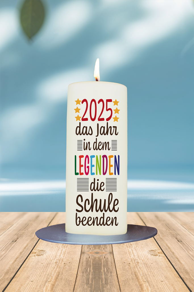 Diese Kerze ist eine farbenfrohe Hommage an alle Schulabgängerinnen und Schulabgänger des Jahres 2025. Im Mittelpunkt steht die kräftige rote Jahreszahl, eingerahmt von jeweils drei gelben Sternen auf beiden Seiten – ein kraftvolles Symbol für Aufbruch, Stolz und einen neuen Lebensabschnitt. Darunter steht in schwarzer Schrift: „Das Jahr, in dem Legenden die Schule beenden“ – wobei das Wort „Legenden“ in bunten Farben besonders hervorgehoben ist. Diese Gestaltung vereint Humor, Wertschätzung und Selbstbewusstsein und macht die Kerze zu einem originellen Geschenk für Abschlussfeiern oder die Schultüte der letzten Klasse. Sie ist ein dekoratives Highlight mit klarer Botschaft und ein bleibendes Andenken an das Abschlussjahr 2025 – für alle, die mit einem Augenzwinkern und einem Hauch Glanz auf ihren Schulabschluss blicken.