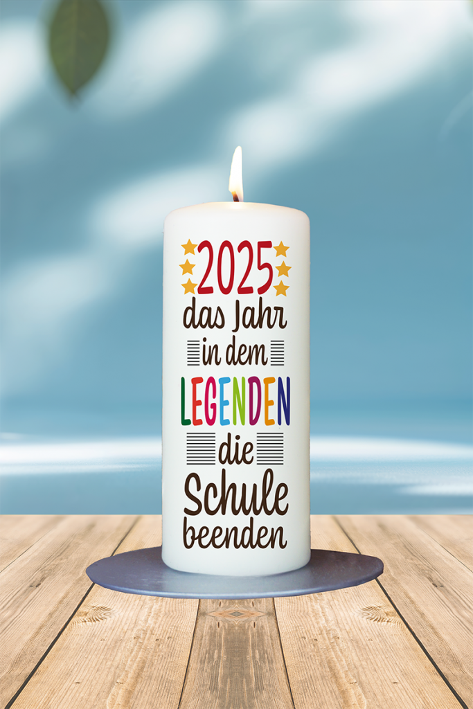Diese Kerze ist eine farbenfrohe Hommage an alle Schulabgängerinnen und Schulabgänger des Jahres 2025. Im Mittelpunkt steht die kräftige rote Jahreszahl, eingerahmt von jeweils drei gelben Sternen auf beiden Seiten – ein kraftvolles Symbol für Aufbruch, Stolz und einen neuen Lebensabschnitt. Darunter steht in schwarzer Schrift: „Das Jahr, in dem Legenden die Schule beenden“ – wobei das Wort „Legenden“ in bunten Farben besonders hervorgehoben ist. Diese Gestaltung vereint Humor, Wertschätzung und Selbstbewusstsein und macht die Kerze zu einem originellen Geschenk für Abschlussfeiern oder die Schultüte der letzten Klasse. Sie ist ein dekoratives Highlight mit klarer Botschaft und ein bleibendes Andenken an das Abschlussjahr 2025 – für alle, die mit einem Augenzwinkern und einem Hauch Glanz auf ihren Schulabschluss blicken.