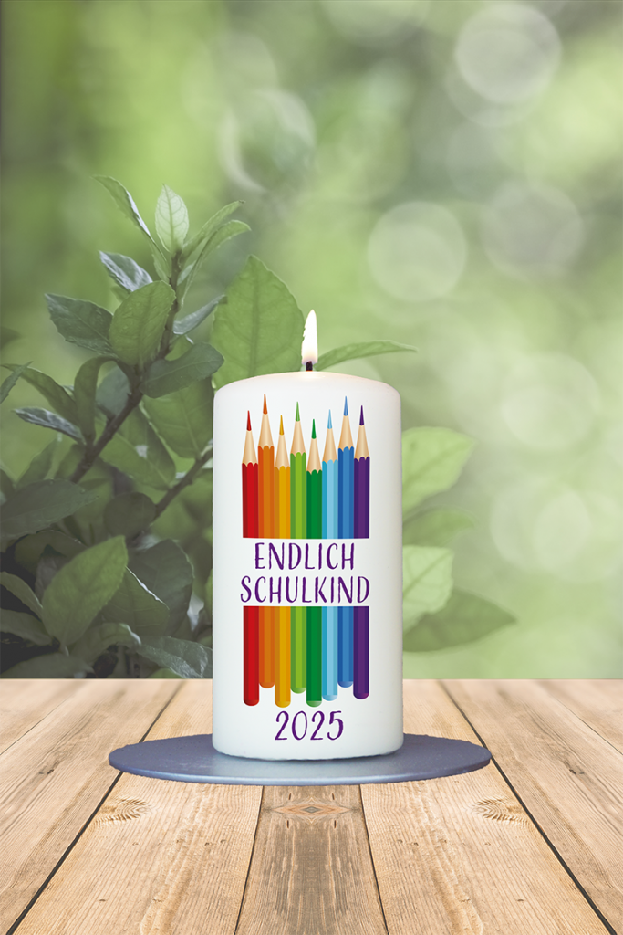 Diese Kerze ist ein fröhlicher Begleiter zum Schulanfang und ein liebevolles Geschenk für kleine ABC-Schützinnen und ABC-Schützen. Das farbenfrohe Motiv zeigt eine Reihe bunter Buntstifte, die nebeneinander aufgereiht sind und die Vorfreude auf den Schulstart spielerisch widerspiegeln. In der Mitte durchzieht der Spruch „Endlich Schulkind“ das Design – ein stolzer Moment, auf den viele Kinder lange hingefiebert haben. Darunter steht das Jahr 2025 und macht die Kerze zu einem besonderen Erinnerungsstück an diesen wichtigen Tag. Ob als Teil der Schultüte, als Tischdeko zur Einschulungsfeier oder als kleines Geschenk zur Einschulung – diese Kerze bringt Farbe, Freude und einen Hauch Aufregung in den Beginn der Schulzeit. Ein liebevolles Detail, das den Start ins Abenteuer Schule noch schöner macht.