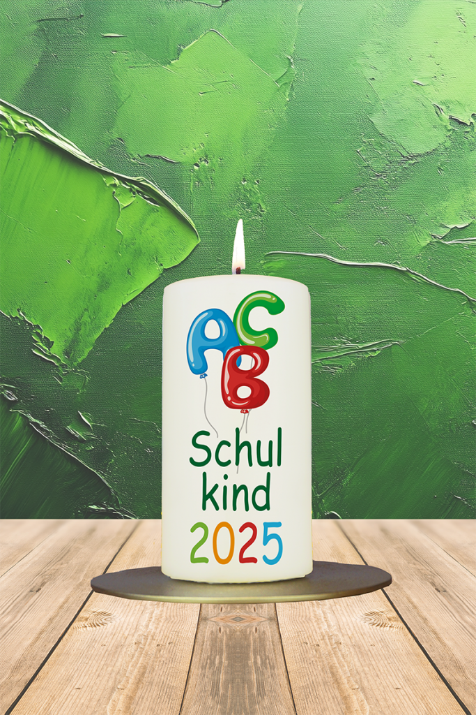 Diese Kerze feiert den Schulstart auf bunte und liebevolle Weise. Im oberen Bereich schweben farbenfrohe Luftballons in den Buchstaben A, B und C – ein verspielter Auftakt für den neuen Lebensabschnitt. Darunter steht in frischem Grün das Wort „Schulkind“, das stolz verkündet, was jetzt offiziell begonnen hat. Den Abschluss bildet die Jahreszahl 2025 in bunten Farben – ein schöner Hinweis auf das besondere Einschulungsjahr. Diese Kerze eignet sich wunderbar als kleines Geschenk zur Einschulung, als Teil der Schultüte oder als dekorativer Begleiter auf der Einschulungsfeier. Mit ihren fröhlichen Farben und der liebevollen Gestaltung wird sie zu einem besonderen Erinnerungsstück an diesen aufregenden ersten Schultag. Ein kleines Licht für einen großen Moment.