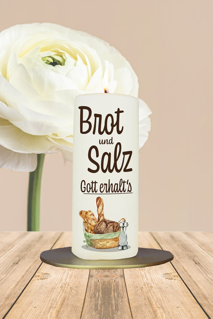 Diese Kerze ist ein traditionelles und herzhaftes Geschenk zur Einweihung eines neuen Hauses. Das Motiv zeigt einen im bäuerlichen Stil gemalten Brotkorb, vor dem ein Salzstreuer platziert ist – ein klassisches Symbol für Gastfreundschaft, Wohlstand und Schutz. Darüber steht in klarer Schrift die Überschrift „Brot und Salz – Gott erhalt’s“, die diesen alten Brauch liebevoll aufgreift und zugleich Glück und Segen für das neue Heim wünscht. Ob als Mitbringsel zur Haussegnung, zur Einweihungsfeier oder als dekoratives Erinnerungsstück – diese Kerze verbindet Tradition mit Herzlichkeit und bringt eine warme, wertschätzende Atmosphäre in jeden Raum. Ein besonderes Licht für einen gelungenen Start im neuen Zuhause.
