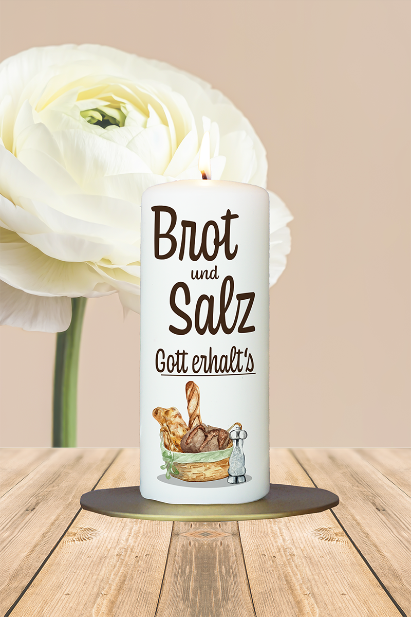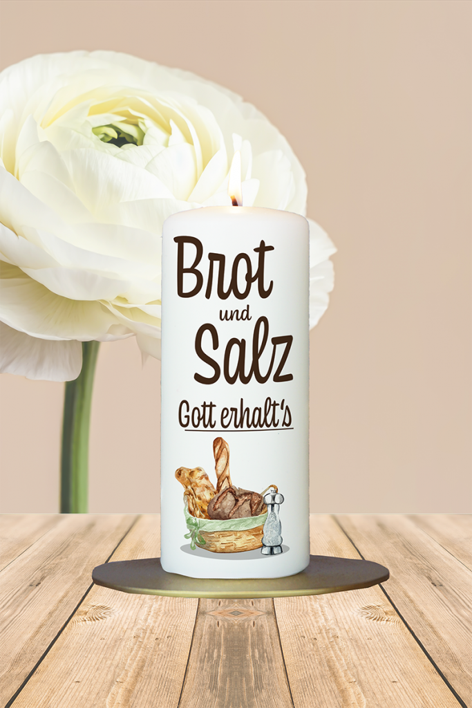 Diese Kerze ist ein traditionelles und herzhaftes Geschenk zur Einweihung eines neuen Hauses. Das Motiv zeigt einen im bäuerlichen Stil gemalten Brotkorb, vor dem ein Salzstreuer platziert ist – ein klassisches Symbol für Gastfreundschaft, Wohlstand und Schutz. Darüber steht in klarer Schrift die Überschrift „Brot und Salz – Gott erhalt’s“, die diesen alten Brauch liebevoll aufgreift und zugleich Glück und Segen für das neue Heim wünscht. Ob als Mitbringsel zur Haussegnung, zur Einweihungsfeier oder als dekoratives Erinnerungsstück – diese Kerze verbindet Tradition mit Herzlichkeit und bringt eine warme, wertschätzende Atmosphäre in jeden Raum. Ein besonderes Licht für einen gelungenen Start im neuen Zuhause.