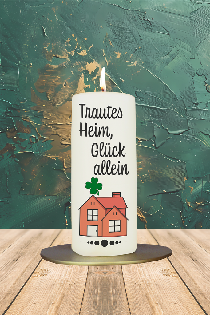 Diese stilvoll gestaltete Kerze ist ein liebevolles Geschenk zum Einzug und vermittelt auf elegante Weise Glück und Geborgenheit. Das Motiv zeigt ein stilisiertes Haus, über dem ein Glückskleeblatt schwebt – ein klassisches Symbol für Glück und positive Energie im neuen Heim. Darüber steht in klarer Schrift die Überschrift „Trautes Heim, Glück allein“, die die tiefe Verbundenheit und das Wohlgefühl ausdrückt, das mit einem eigenen Zuhause einhergeht. Ob als Geschenk zur Einweihung, als dekorativer Akzent oder als Erinnerung an einen neuen Lebensabschnitt – diese Kerze bringt Wärme, Hoffnung und eine besondere Atmosphäre in jeden Raum. Ein stimmungsvolles Licht für ein Zuhause voller Glück.