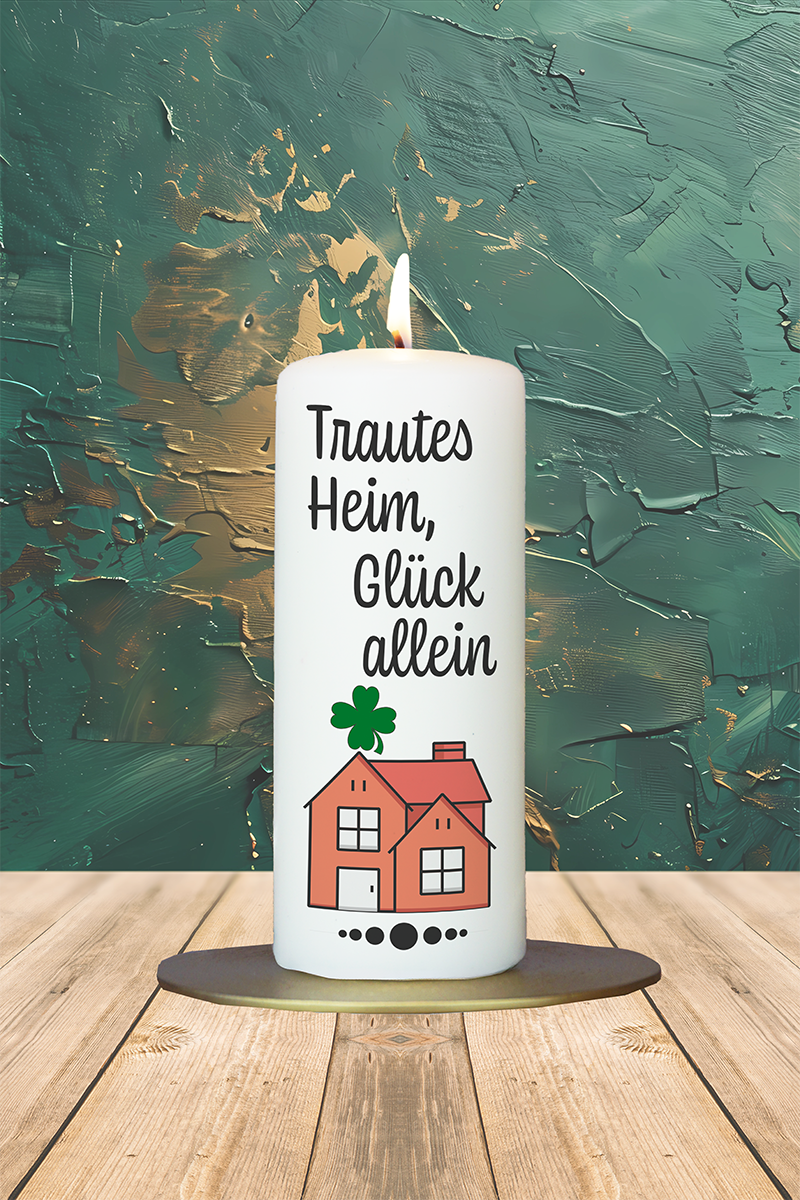 Diese stilvoll gestaltete Kerze ist ein liebevolles Geschenk zum Einzug und vermittelt auf elegante Weise Glück und Geborgenheit. Das Motiv zeigt ein stilisiertes Haus, über dem ein Glückskleeblatt schwebt – ein klassisches Symbol für Glück und positive Energie im neuen Heim. Darüber steht in klarer Schrift die Überschrift „Trautes Heim, Glück allein“, die die tiefe Verbundenheit und das Wohlgefühl ausdrückt, das mit einem eigenen Zuhause einhergeht. Ob als Geschenk zur Einweihung, als dekorativer Akzent oder als Erinnerung an einen neuen Lebensabschnitt – diese Kerze bringt Wärme, Hoffnung und eine besondere Atmosphäre in jeden Raum. Ein stimmungsvolles Licht für ein Zuhause voller Glück.