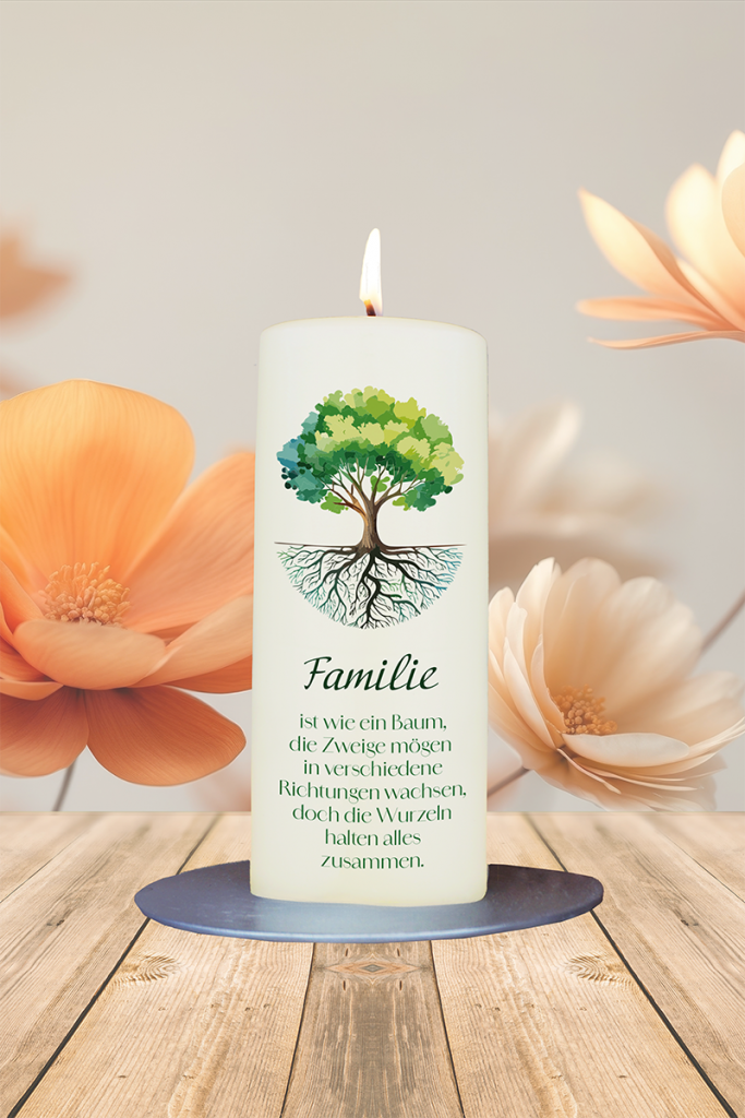 Diese Kerze ist ein liebevolles Symbol für Zusammenhalt und Verbundenheit innerhalb der Familie. Das Motiv zeigt einen starken grünen Baum, dessen obere Halbkugel von kräftigen Zweigen geprägt ist, während die untere Halbkugel mächtige Wurzeln darstellt. Dazu ergänzt der Text „Familie ist wie ein Baum, die Zweige mögen in verschiedene Richtungen wachsen, doch die Wurzeln halten alles zusammen“ diese kraftvolle Botschaft auf einfühlsame Weise. Diese Kerze eignet sich wunderbar als Geschenk für Familienfeste, als Dekoration oder einfach als Zeichen der Wertschätzung für die Menschen, die einem am Herzen liegen. Sie erinnert daran, wie wichtig Halt und Zusammengehörigkeit sind – ein stimmungsvolles Licht für die Familie.
