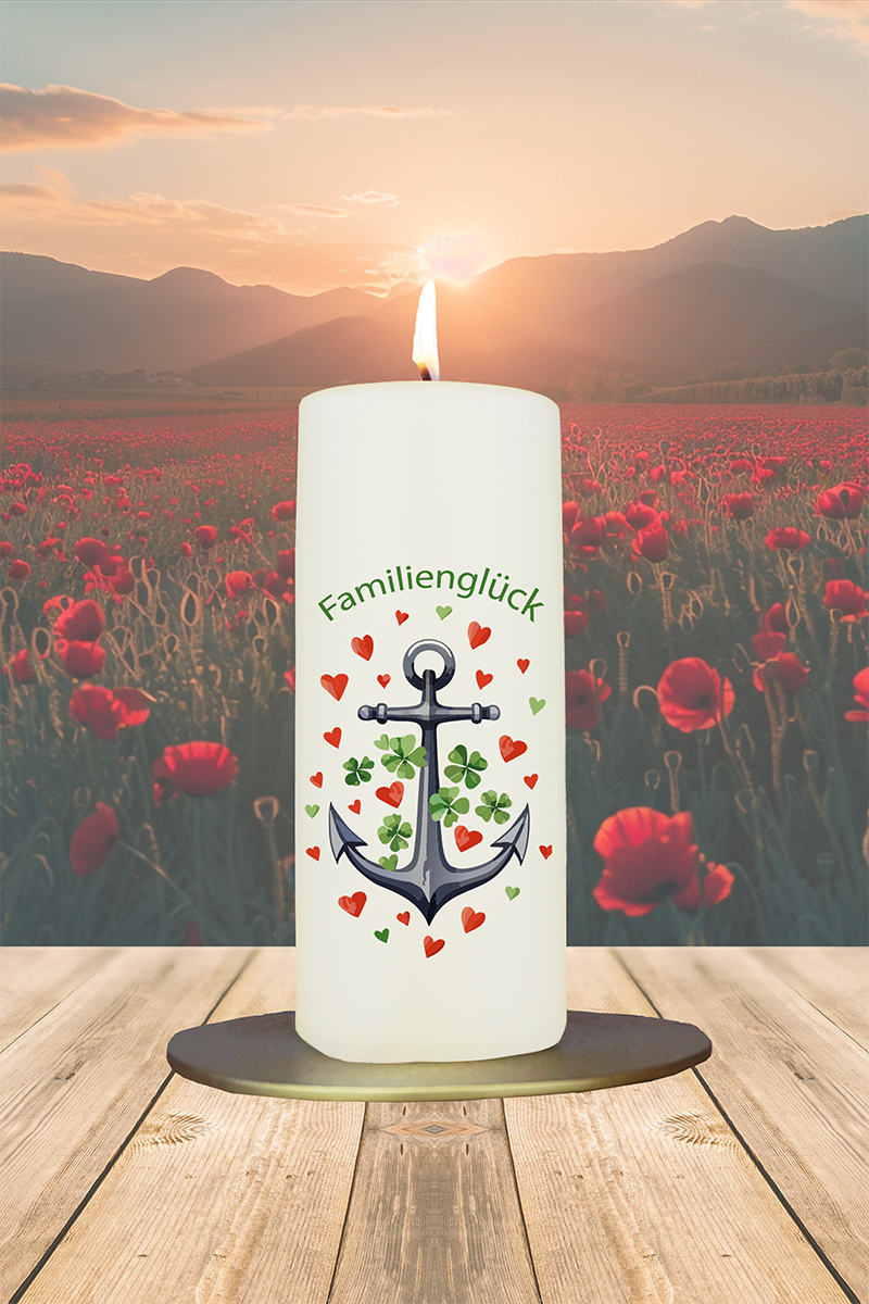 Diese Kerze ist ein liebevolles Symbol für Halt, Liebe und Glück innerhalb der Familie. Im Mittelpunkt steht ein großer, kräftiger Anker, der für Sicherheit und Zusammenhalt steht. Umgeben ist er von vielen kleinen roten und grünen Herzen sowie grünen Glückskleeblättern, die Liebe, Freude und positive Energie verkörpern. Darüber steht die Überschrift „Familienglück“, die die besondere Bedeutung von Geborgenheit und gemeinsamen Momenten unterstreicht. Ob als Geschenk für Familienfeste, als dekoratives Element im Zuhause oder als Ausdruck der Wertschätzung – diese Kerze bringt Wärme und Zuversicht in jeden Raum und erinnert daran, wie wertvoll das Glück in der Familie ist.