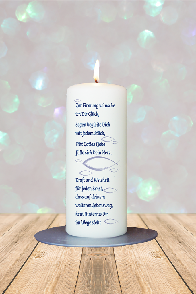 Diese symbolstarke Kerze ist ein besonderes Geschenk zur Firmung, das Glauben, gute Wünsche und christliche Verbundenheit auf stimmige Weise vereint. Die Gestaltung zeigt Fische – in unterschiedlichen Größen, die Gemeinschaft, Glauben und die Zugehörigkeit zur christlichen Tradition symbolisieren. Begleitet wird das Motiv von einem poetischen Segensspruch: „Zur Firmung wünsche ich Dir Glück, Segen begleite Dich mit jedem Stück, mit Gottes Liebe fülle sich Dein Herz, Kraft und Weisheit für jeden Ernst, dass auf deinem Lebensweg, kein Hindernis Dir im Wege steht.“ Die Worte schenken Mut und Zuversicht und machen die Kerze zu einem bleibenden Licht für den weiteren Lebensweg. Ob als Geschenk von Familie, Paten oder Freunden – diese Kerze verbindet tiefe Bedeutung mit liebevoller Gestaltung und begleitet den Firmungstag mit einer Botschaft, die von Herzen kommt. Ein Licht des Segens und der inneren Stärke.