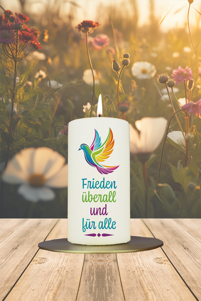 Diese farbenfrohe Kerze ist ein leuchtendes Zeichen für Frieden, Vielfalt und Hoffnung. Das zentrale Motiv zeigt eine stilisierte Friedenstaube in den Farben des Regenbogens – Symbol für Toleranz, Zusammenhalt und den Wunsch nach einer friedlichen Welt für alle Menschen. Direkt darunter steht in bunten Buchstaben die klare Botschaft: „Frieden überall und für alle“. Die lebendige Gestaltung vermittelt Freude und Ernsthaftigkeit zugleich und spricht generationsübergreifend an. Ob als Zeichen für mehr Miteinander im Kleinen oder als stiller Appell für den Weltfrieden – diese Kerze bringt Licht in jede Umgebung und erinnert daran, dass jeder Tag eine Gelegenheit ist, Frieden zu leben und weiterzugeben. Ein kraftvolles Symbol für Menschlichkeit und Hoffnung.