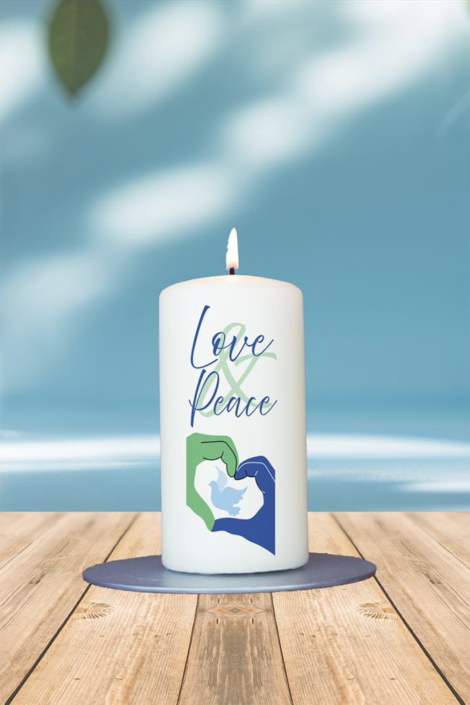 Diese ausdrucksstarke Kerze setzt ein klares Zeichen für Zusammenhalt, Mitgefühl und friedliches Miteinander. Zwei stilisierte Hände – eine in Grün, eine in Blau – formen gemeinsam ein Herz, in dessen Mitte die Silhouette einer Friedenstaube erscheint. Dieses kraftvolle Bild vereint symbolisch die Werte von Verbundenheit, Hoffnung und gegenseitigem Respekt. Gekrönt wird das Motiv von der Überschrift „Love & Peace“ in Blau und Grün – eine farbliche Fortführung der Hände und ein klares Statement für eine Welt, in der Liebe und Frieden Hand in Hand gehen. Die Gestaltung spricht sowohl emotional als auch visuell an und eignet sich als Geschenk oder stilles Zeichen der Verbundenheit in Zeiten, in denen der Wunsch nach Frieden aktueller denn je ist. Eine Kerze, die Wärme spendet, zum Nachdenken anregt und Hoffnung schenkt – für alle, die an eine bessere Welt glauben.
