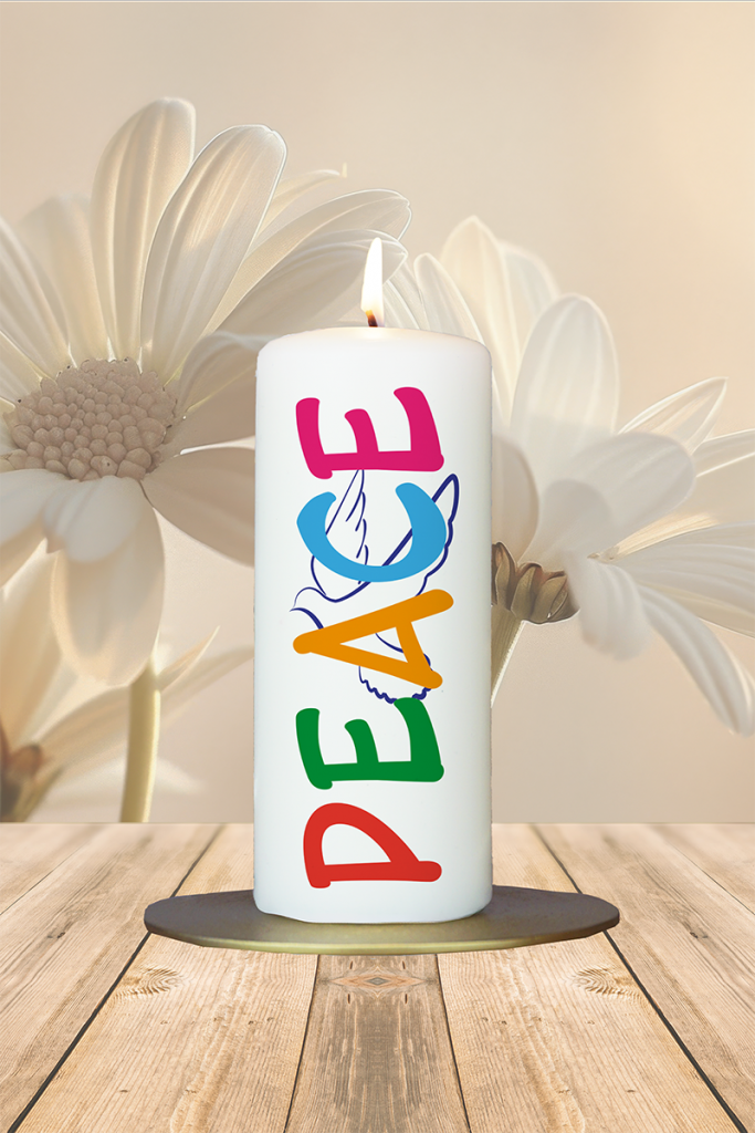 Diese modern und kraftvoll gestaltete Kerze setzt ein klares visuelles Zeichen für den Frieden. Im Zentrum steht die dunkelblaue Silhouette einer Friedenstaube – schlicht, aber ausdrucksstark – als klassisches Symbol für Hoffnung, Versöhnung und friedliches Miteinander. Darüber zieht sich das Wort „PEACE“ in kräftigen, bunten Buchstaben senkrecht von unten nach oben über die Kerze und bringt die Botschaft unübersehbar auf den Punkt. Die Kombination aus klarer Formensprache und leuchtenden Farben macht diese Kerze zu einem eindrucksvollen Statement für Toleranz, Zusammenhalt und Menschlichkeit. Ob als Zeichen des persönlichen Wunsches nach Frieden oder als Geschenk mit starker Aussage – diese Kerze bringt Licht in dunkle Zeiten und erinnert daran, dass jeder Moment zählt, um ein Zeichen zu setzen. Ein leuchtender Appell für mehr Frieden – klar, mutig und hoffnungsvoll.