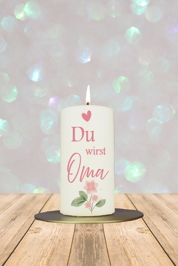 Diese zart gestaltete Kerze ist eine wundervolle Möglichkeit, eine ganz besondere Botschaft auf liebevolle Weise zu überbringen: „Du wirst Oma“. Im unteren Bereich der Kerze erblüht eine filigrane Blume in sanften, natürlichen Farbtönen mit einer rosa Blüte als zartem Blickfang. Darüber steht in verspielter rosa Schrift, verziert mit kleinem Herzchen, die emotionale Botschaft – ein Moment voller Freude, Überraschung und Vorfreude. Diese Kerze ist nicht nur ein dekoratives Highlight, sondern auch ein ganz persönliches Erinnerungsstück an einen unvergesslichen Augenblick. Ein Licht, das strahlt, wenn ein neues Kapitel beginnt – für das Herz einer zukünftigen Großmutter.