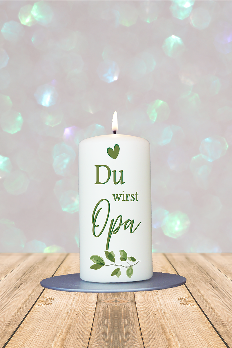 Diese liebevoll gestaltete Kerze ist eine ganz besondere Botschaft für einen werdenden Großvater: „Du wirst Opa“. Der Text ist in freundlichem Grün mit Herzchen gehalten und verkündet die freudige Nachricht mit Herzenswärme. Darunter ziert ein feiner Zweig mit grünen Blättern die Kerze – ein Symbol für neues Leben, Wachstum und familiäre Verbundenheit. Diese Kerze ist nicht nur ein stilvolles Geschenk, sondern auch ein emotionales Andenken an den Moment, in dem ein neues Familienkapitel beginnt. Ein kleines Licht, das große Freude ankündigt.