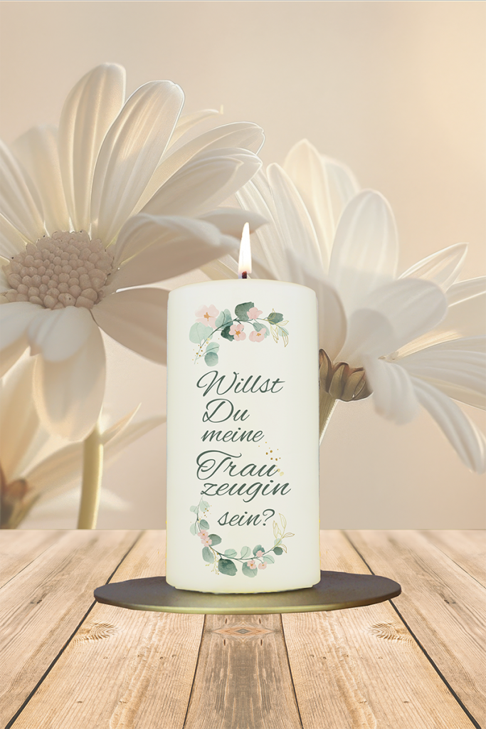 Diese stilvolle Kerze trägt die bedeutungsvolle Frage: „Willst Du meine Trauzeugin sein?“ – zart eingerahmt von zwei feinen Eukalyptuszweigen in sanften Pastellfarben. Die edle, handgeschriebene Schrift vermittelt emotionale Tiefe und persönliche Nähe. Die Eukalyptuszweige stehen symbolisch für Freundschaft, Vertrauen und Beständigkeit – perfekte Werte für eine Trauzeugin. Diese liebevoll gestaltete Kerze ist ein besonderes, bleibendes Erinnerungsstück und eine wunderschöne Art, eine Herzensfrage auf ganz persönliche Weise zu stellen.