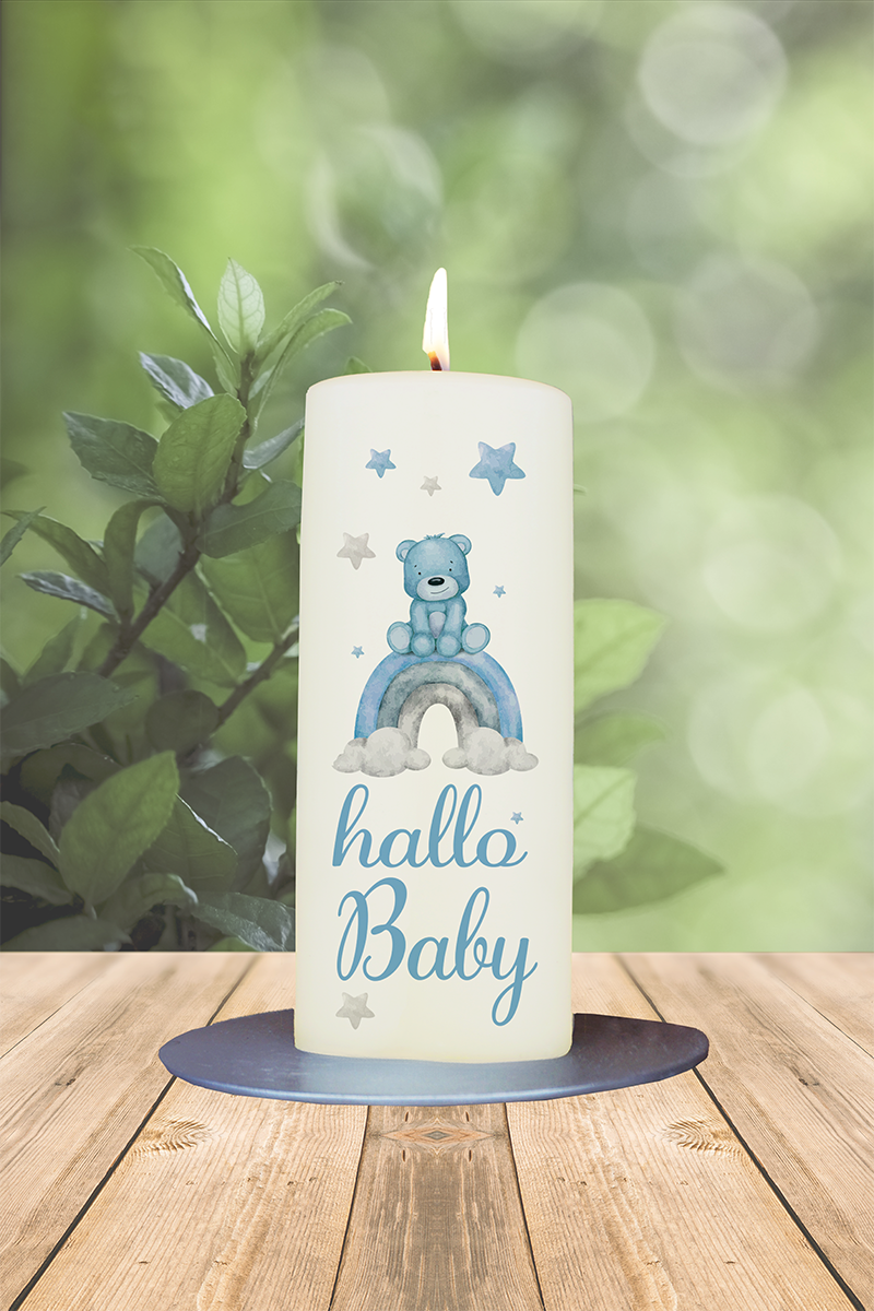 Geburtskerze 15x6cm Hallo Baby Teddy blau