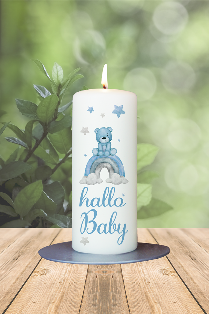 Geburtskerze 15x6cm Hallo Baby Teddy blau