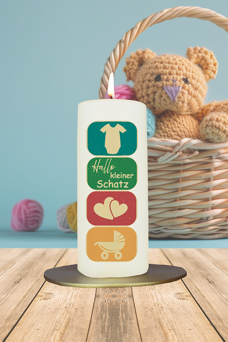 Diese farbenfrohe und liebevoll gestaltete Kerze bringt die Freude über ein neues Leben auf ausdrucksstarke und charmante Weise zum Leuchten. Waagerecht übereinander angeordnete Rechtecke in bunten, fröhlichen Farben zeigen drei symbolhafte Piktogramme: ein Strampler als Zeichen für den Start ins Leben, kleine Herzen für die allgegenwärtige Liebe und einen Kinderwagen als Symbol für Fürsorge und Geborgenheit. Abgerundet wird das verspielte Design durch den liebevollen Schriftzug „Hallo kleiner Schatz“, der das Willkommen auf eine herzliche Art unterstreicht. Diese Kerze eignet sich ideal als Geschenk zur Geburt oder als liebevolles Andenken an den Beginn eines neuen Kapitels – lebendig, warmherzig und voller kindlicher Freude.