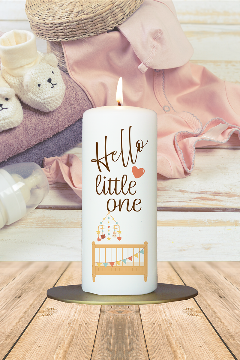 Diese zart illustrierte Kerze ist eine liebevolle Hommage an das erste große Willkommen für ein neugeborenes Kind. Im Mittelpunkt steht ein stilisiertes Holzkinderbett mit klassischen Gitterstäben, liebevoll geschmückt mit einer pastellfarbenen Wimpelkette, die sich fröhlich von einem Bettende zum anderen spannt. Darüber schwebt ein zartes Mobile mit kleinen Sternen und Herzen – ein Symbol für Geborgenheit, Träume und die liebevolle Fürsorge, die den neuen Erdenbürger erwartet. Gekrönt wird das Motiv von der herzlichen Überschrift „Hello little one“, ergänzt durch kleine Herzchen, die die emotionale Botschaft unterstreichen. Die sanfte Farbgebung in Pastelltönen macht diese Kerze zu einem besonders stimmungsvollen Geschenk zur Geburt. Sie spendet nicht nur warmes Licht, sondern auch ein Gefühl von Liebe, Ankommen und Lebensfreude – ein bezauberndes Andenken an einen unvergesslichen Neubeginn.