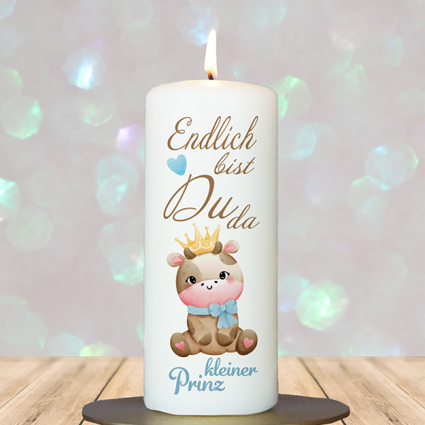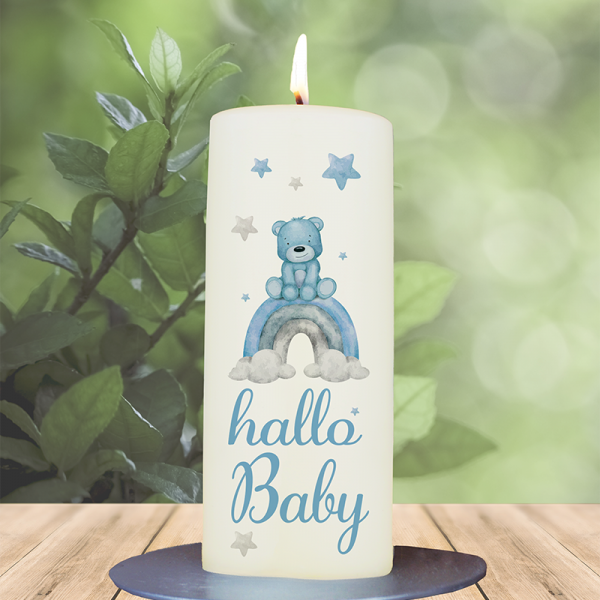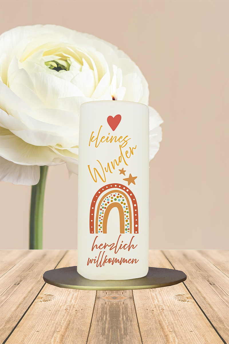 Diese liebevoll gestaltete Kerze ist eine zauberhafte Würdigung des kleinen Wunders, das mit der Geburt eines Kindes beginnt, und verbindet stilvolle Gestaltung mit einer warmen, einladenden Botschaft. Im Mittelpunkt steht ein detailreicher Regenbogen im dekorativen Paisley-Stil, dessen Bögen in harmonischen Orangetönen gehalten sind – Farben, die Wärme, Lebensfreude und Geborgenheit ausstrahlen. Die Überschrift „Kleines Wunder“ wird von einem orangenen Herz und kleinen Sternen in passenden Farbtönen begleitet und unterstreicht die Einzigartigkeit dieses besonderen Moments. Direkt unter dem Regenbogen heißt der liebevolle Schriftzug „herzlich Willkommen“ das Neugeborene in der Welt willkommen. Ob als Geschenk zur Geburt oder als bleibende Erinnerung an diesen bedeutenden Tag – diese Kerze vereint dekorative Eleganz mit einer tiefen emotionalen Botschaft und wird zu einem wertvollen Lichtspender voller Liebe.