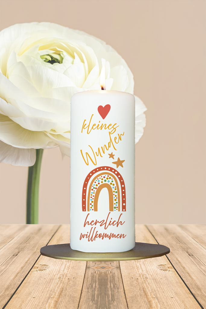 Diese liebevoll gestaltete Kerze ist eine zauberhafte Würdigung des kleinen Wunders, das mit der Geburt eines Kindes beginnt, und verbindet stilvolle Gestaltung mit einer warmen, einladenden Botschaft. Im Mittelpunkt steht ein detailreicher Regenbogen im dekorativen Paisley-Stil, dessen Bögen in harmonischen Orangetönen gehalten sind – Farben, die Wärme, Lebensfreude und Geborgenheit ausstrahlen. Die Überschrift „Kleines Wunder“ wird von einem orangenen Herz und kleinen Sternen in passenden Farbtönen begleitet und unterstreicht die Einzigartigkeit dieses besonderen Moments. Direkt unter dem Regenbogen heißt der liebevolle Schriftzug „herzlich Willkommen“ das Neugeborene in der Welt willkommen. Ob als Geschenk zur Geburt oder als bleibende Erinnerung an diesen bedeutenden Tag – diese Kerze vereint dekorative Eleganz mit einer tiefen emotionalen Botschaft und wird zu einem wertvollen Lichtspender voller Liebe.