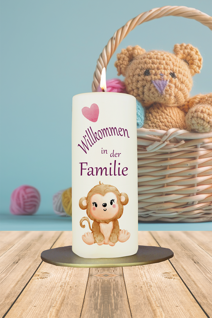 Geburtskerze 15x6cm Willkommen in der Familie Affe
