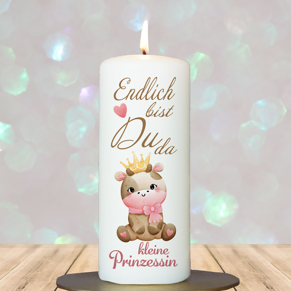 Diese liebevoll gestaltete Kerze ist ein fröhlicher Willkommensgruß für das neue Familienmitglied. Im Mittelpunkt steht ein kleines, niedlich gezeichnetes Äffchen, das mit seinem verspielten Blick und seinem aufgeweckten Wesen Lebensfreude und Herzlichkeit ausstrahlt. Die darüber stehende Überschrift „Willkommen in der Familie“, liebevoll mit kleinen Herzchen geschmückt, symbolisiert die Freude und Wärme, die ein neugeborenes Kind ins Leben bringt. Die kindgerechte Gestaltung in weichen Farben macht diese Kerze zu einem besonderen Geschenk zur Geburt oder zu einem wertvollen Erinnerungsstück an diesen einzigartigen Moment. Ein liebevolles Licht für den Beginn eines großen Abenteuers.