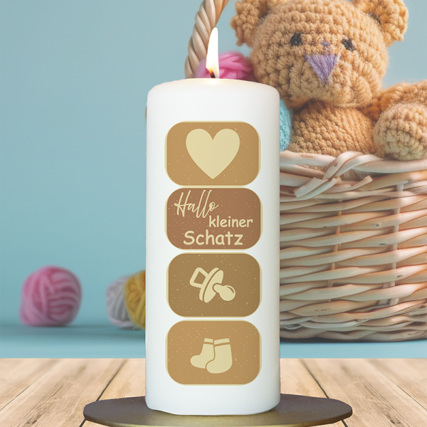 Diese liebevoll gestaltete Kerze ist ein fröhlicher Willkommensgruß für das neue Familienmitglied. Im Mittelpunkt steht ein kleines, niedlich gezeichnetes Äffchen, das mit seinem verspielten Blick und seinem aufgeweckten Wesen Lebensfreude und Herzlichkeit ausstrahlt. Die darüber stehende Überschrift „Willkommen in der Familie“, liebevoll mit kleinen Herzchen geschmückt, symbolisiert die Freude und Wärme, die ein neugeborenes Kind ins Leben bringt. Die kindgerechte Gestaltung in weichen Farben macht diese Kerze zu einem besonderen Geschenk zur Geburt oder zu einem wertvollen Erinnerungsstück an diesen einzigartigen Moment. Ein liebevolles Licht für den Beginn eines großen Abenteuers.