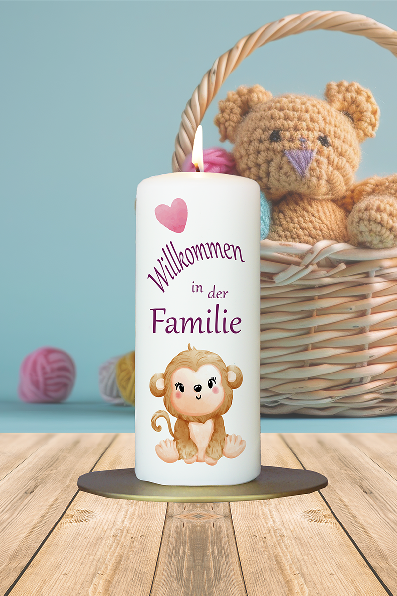 Geburtskerze 15x6cm Willkommen in der Familie Affe