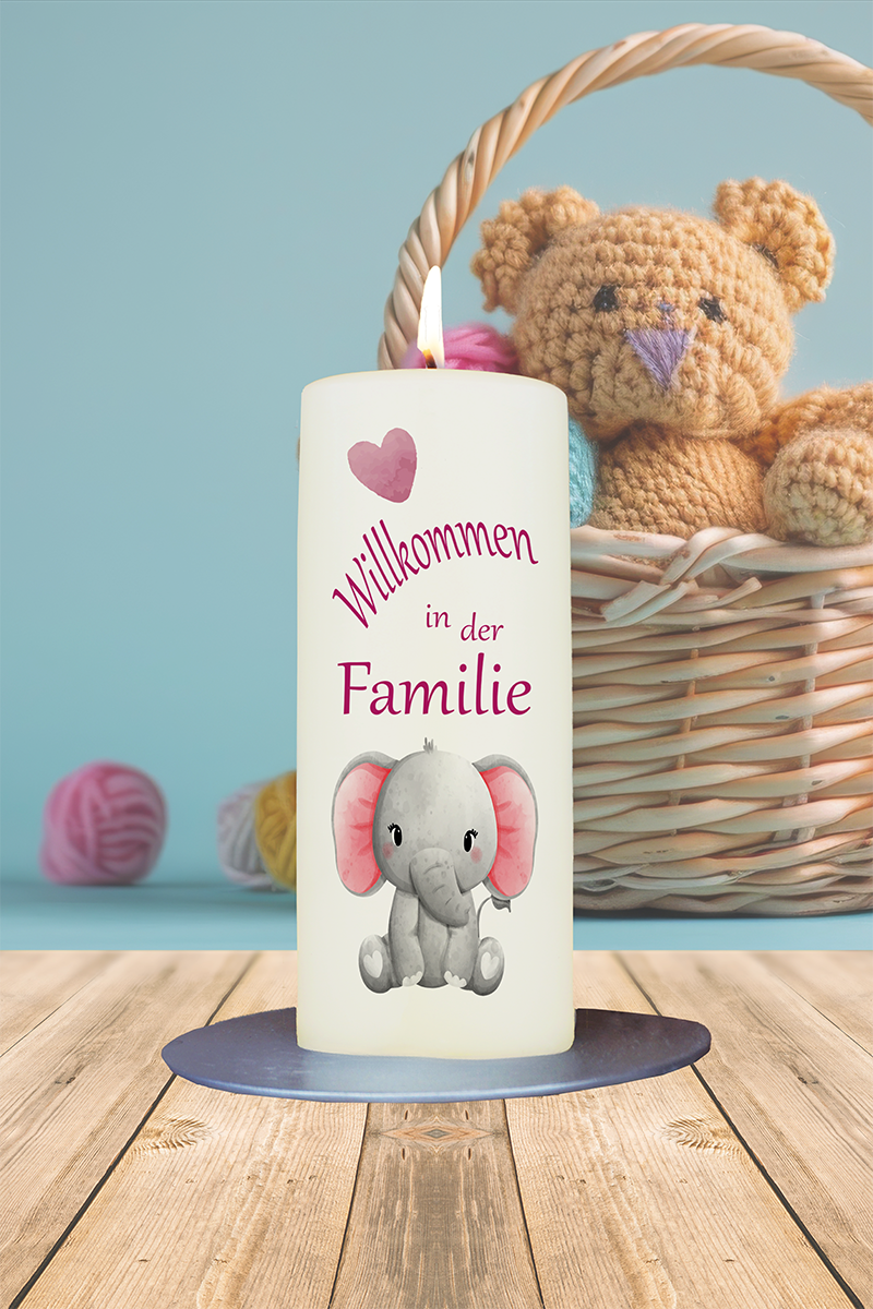 Geburtskerze 15x6cm Willkommen in der Familie Elefant