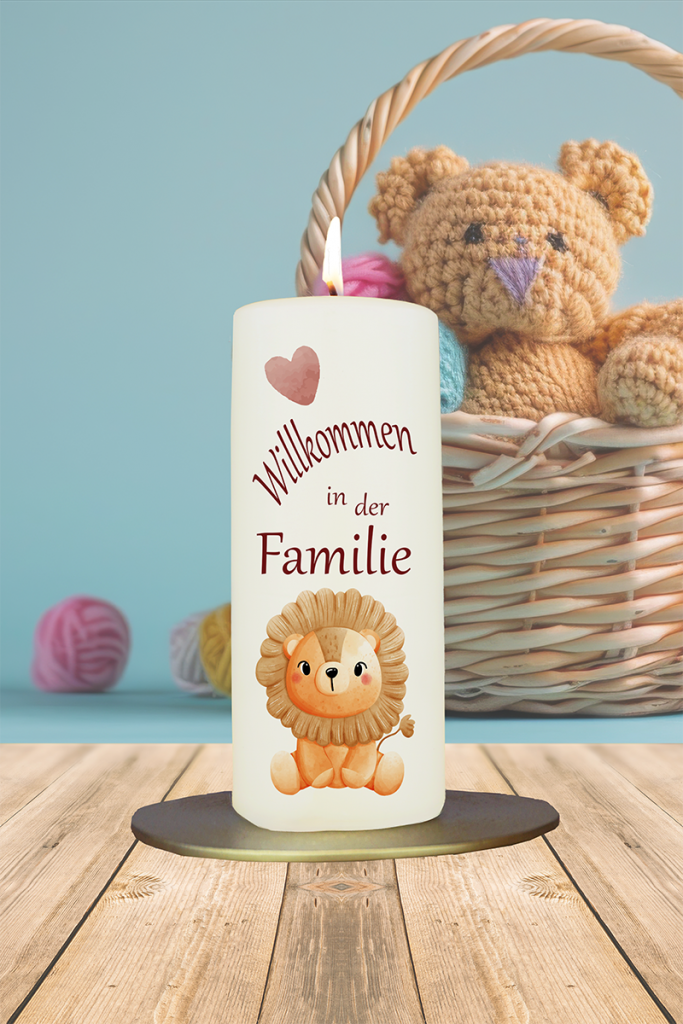 Geburtskerze 15x6cm Willkommen in der Familie Löwe