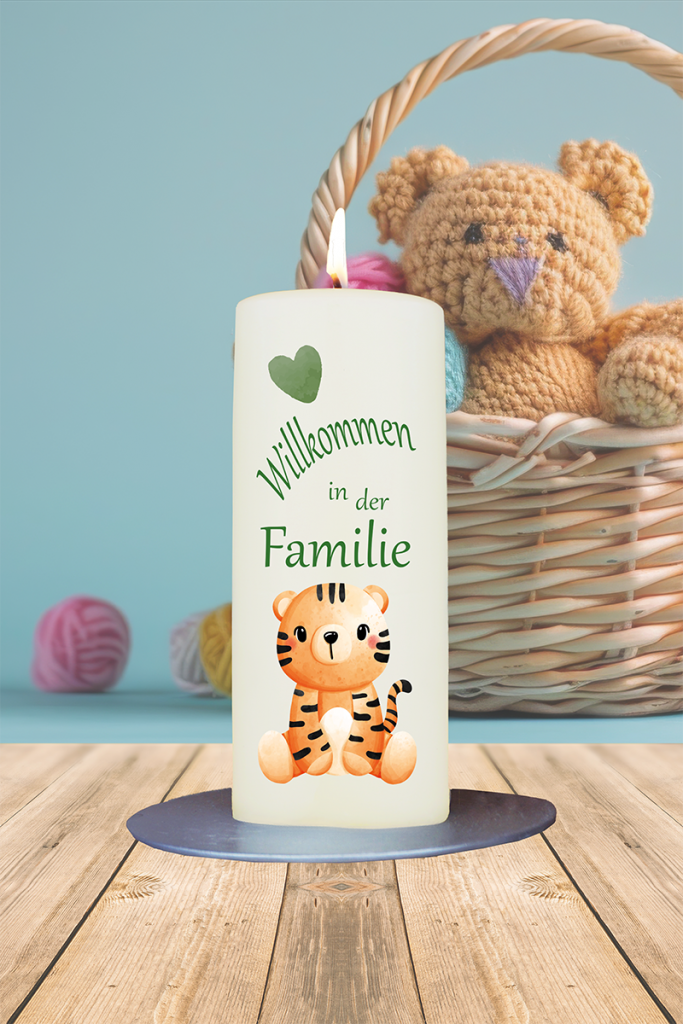 Geburtskerze 15x6cm Willkommen in der Familie Tiger