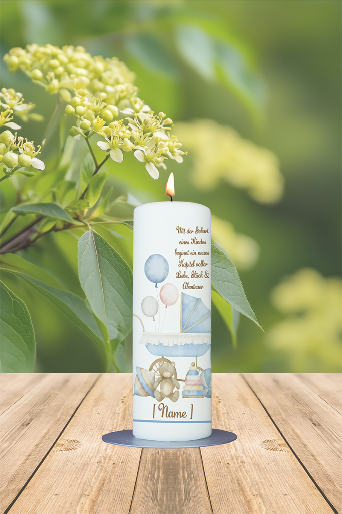 Diese stilvoll illustrierte Kerze fängt die besondere Stimmung rund um die Geburt eines Kindes auf liebevolle Weise ein. Im Mittelpunkt steht ein nostalgisch anmutender Kinderwagen in zartem Hellblau, der von schwebenden Luftballons in sanften Tönen von Weiß, Blau, Beige und Rosa umrahmt wird – ein zarter Hinweis auf die Freude und Leichtigkeit, die ein neues Leben mit sich bringt. Unter dem Wagen befinden sich verschiedene liebevoll gezeichnete Spielzeuge, die für Neugier, Entdeckungslust und erste Abenteuer stehen. Darüber liest man die gefühlvolle Überschrift: „Mit der Geburt eines Kindes beginnt ein Kapitel voller Liebe, Glück & Abenteuer“ – eine Botschaft, die das Herz berührt. Der Name „Name“ ist beispielhaft eingesetzt und kann selbstverständlich individuell angepasst werden, ebenso wie das Geburtsdatum, das das persönliche Andenken abrundet. Diese Kerze ist ein besonderes Geschenk zur Geburt, das nicht nur Licht spendet, sondern auch Erinnerungen bewahrt – stilvoll, emotional und voller Wärme.