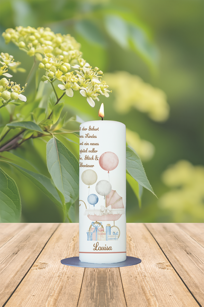 Diese detailverliebt gestaltete Kerze ist ein stimmungsvolles Geschenk zur Geburt und erinnert an den magischen Moment, in dem ein neues Leben beginnt. Im Zentrum steht ein nostalgischer Kinderwagen in zartem Rosa, geschmückt mit schwebenden Luftballons in sanften Tönen von Weiß, Blau, Beige und Rosa – ein Sinnbild für Leichtigkeit, Freude und Aufbruch. Zu Füßen des Wagens liegen liebevoll verpackte Geschenke in Blau und Rosa, die die Vorfreude und Zuwendung zum neuen Erdenbürger symbolisieren. Gekrönt wird das Motiv von der emotionalen Überschrift: „Mit der Geburt eines Kindes beginnt ein Kapitel voller Liebe, Glück & Abenteuer“. Der Name „Louisa“ ist als Beispiel dargestellt und kann selbstverständlich individuell angepasst werden – ebenso wie das Geburtsdatum, um dieses besondere Ereignis ganz persönlich festzuhalten. Diese Kerze ist mehr als ein dekoratives Element – sie ist ein warmes Licht voller Bedeutung, das den Zauber des Anfangs bewahrt und immer wieder aufs Neue daran erinnert.