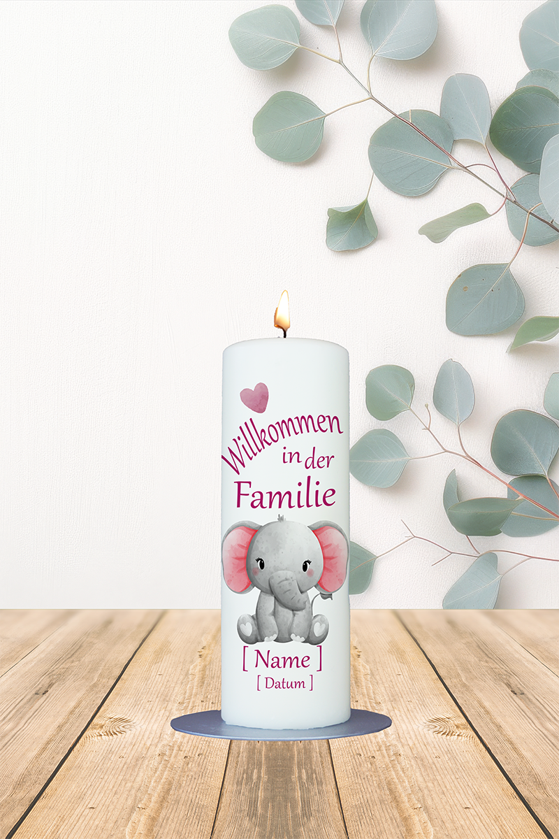 Geburtskerze 20x7cm Willkommen in der Familie Elefant