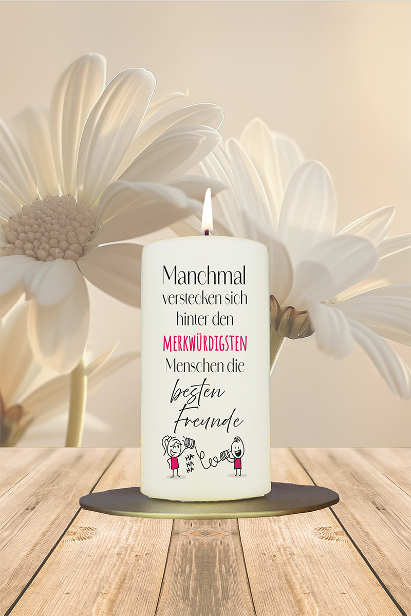Diese liebevoll gestaltete Kerze zeigt zwei einfach gezeichnete Kinder, die mit einem Dosen-Schnurtelefon spielen – ein nostalgisches Symbol für Freundschaft und kindliche Unbeschwertheit. Die Überschrift „Manchmal verstecken sich hinter den merkwürdigsten Menschen die besten Freunde“ bringt auf charmante Weise zum Ausdruck, wie besondere Freundschaften oft dort entstehen, wo man sie am wenigsten erwartet. Ein herzerwärmendes Geschenk für Freunde, das Erinnerungen an gemeinsame Momente und die Bedeutung von Freundschaft auf zauberhafte Weise einfängt.