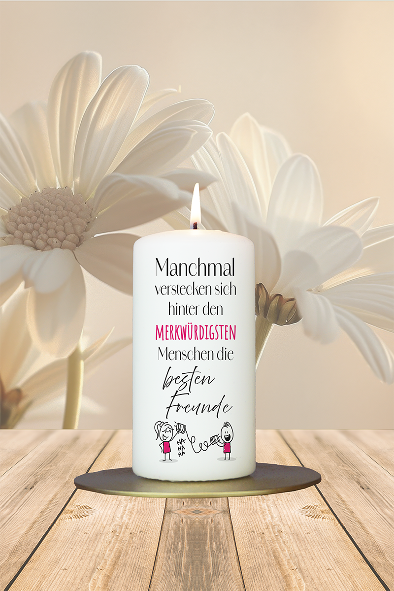 Diese liebevoll gestaltete Kerze zeigt zwei einfach gezeichnete Kinder, die mit einem Dosen-Schnurtelefon spielen – ein nostalgisches Symbol für Freundschaft und kindliche Unbeschwertheit. Die Überschrift „Manchmal verstecken sich hinter den merkwürdigsten Menschen die besten Freunde“ bringt auf charmante Weise zum Ausdruck, wie besondere Freundschaften oft dort entstehen, wo man sie am wenigsten erwartet. Ein herzerwärmendes Geschenk für Freunde, das Erinnerungen an gemeinsame Momente und die Bedeutung von Freundschaft auf zauberhafte Weise einfängt.