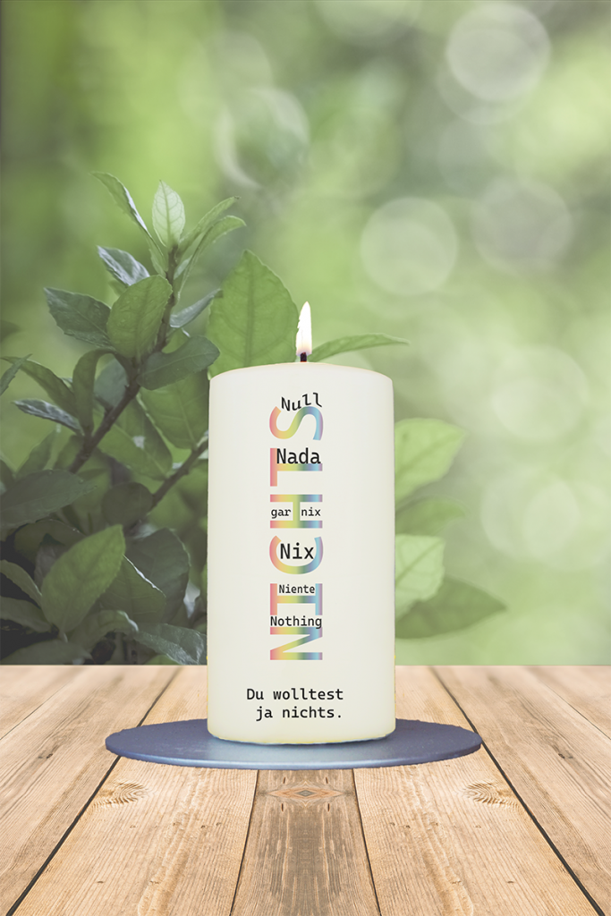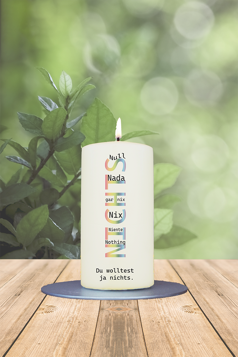 Diese humorvoll gestaltete Kerze ist das perfekte Geschenk für alle, die immer sagen: „Ich will wirklich nichts.“ In bunten Buchstaben steht senkrecht das Wort „Nichts“, gefolgt von augenzwinkernden Varianten wie „Null, Nada, gar nix, Nix, Niente, Nothing – Du wolltest ja nichts“. Ein kreatives Mitbringsel mit Witz und Charme – ideal für Geburtstage, kleine Überraschungen oder einfach so. Denn manchmal ist „nichts“ eben genau das Richtige!