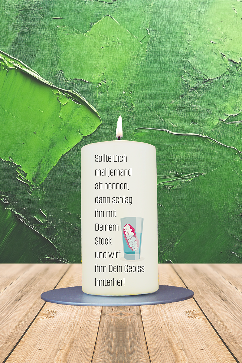 Ein Geschenk mit einem Augenzwinkern! Diese humorvolle Kerze zeigt ein gezeichnetes Glas mit einem Gebiss und trägt den frechen Spruch: „Sollte Dich jemand alt nennen, dann schlag ihn mit Deinem Stock und wirf ihm Dein Gebiss hinterher.“ Perfekt geeignet für Geburtstage oder einfach als kleine Überraschung für Menschen mit Sinn für Humor. Ein echter Hingucker mit Lachgarantie – ideal für alle, die das Älterwerden mit Leichtigkeit und Witz nehmen!