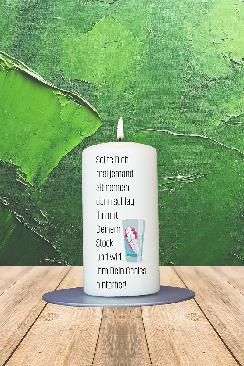 Ein Geschenk mit einem Augenzwinkern! Diese humorvolle Kerze zeigt ein gezeichnetes Glas mit einem Gebiss und trägt den frechen Spruch: „Sollte Dich jemand alt nennen, dann schlag ihn mit Deinem Stock und wirf ihm Dein Gebiss hinterher.“ Perfekt geeignet für Geburtstage oder einfach als kleine Überraschung für Menschen mit Sinn für Humor. Ein echter Hingucker mit Lachgarantie – ideal für alle, die das Älterwerden mit Leichtigkeit und Witz nehmen!