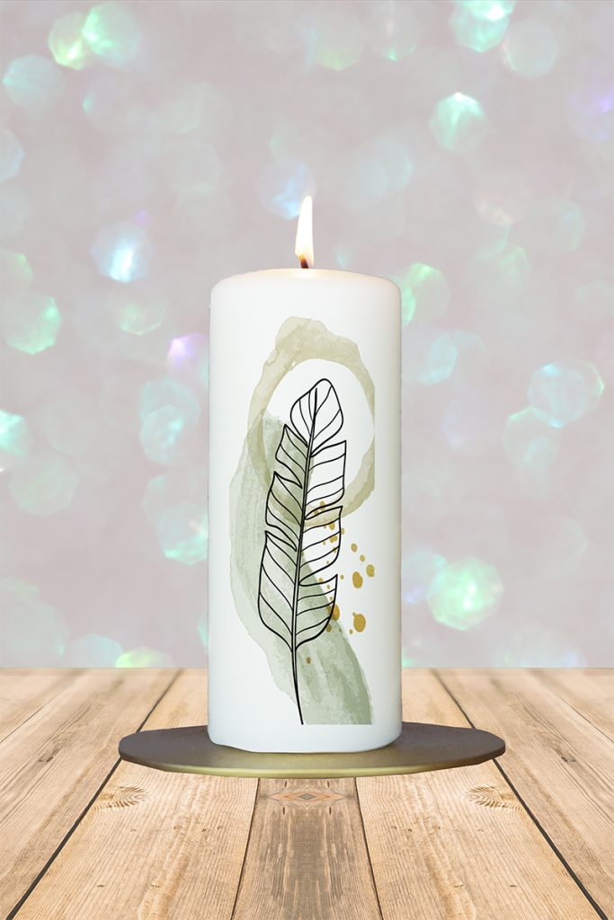 Schlicht, stilvoll und voller Naturverbundenheit: Diese geschmackvolle Kerze zeigt ein stilisiertes Blatt vor einem sanften, pastellgrünen Hintergrund. Die reduzierte Gestaltung strahlt Ruhe, Achtsamkeit und Natürlichkeit aus – ideal als kleines, liebevolles Geschenk für Menschen, die die Schönheit im Einfachen sehen. Ein harmonisches Lichtobjekt, das Gelassenheit und Frische in jeden Raum bringt.