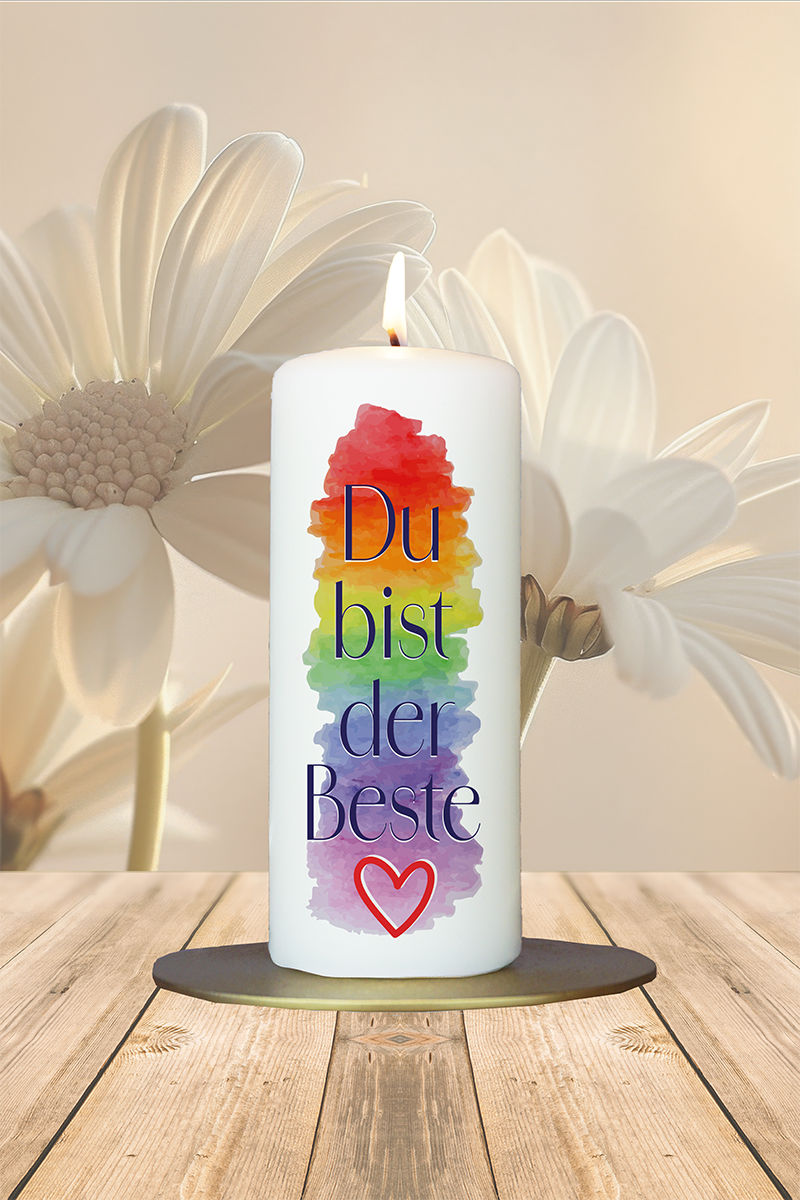 Strahlend bunt und voller Wertschätzung: Diese liebevoll gestaltete Kerze trägt den Text „Du bist der Beste“ in kräftigen Buchstaben, begleitet von einem roten Herz auf einem leuchtend regenbogenfarbenen Hintergrund. Ein farbenfrohes Zeichen der Anerkennung und Dankbarkeit – ideal, um einem besonderen Menschen ein Lächeln ins Gesicht zu zaubern. Diese Kerze sagt auf charmante Weise: „Schön, dass es dich gibt!“