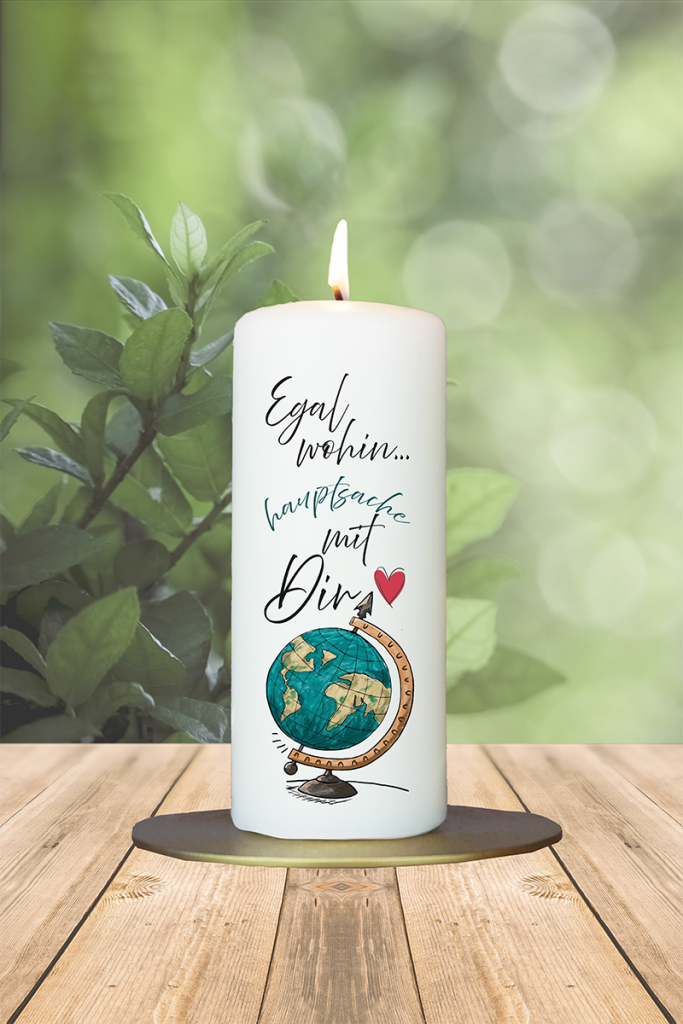 Diese liebevoll gestaltete Kerze zeigt einen Globus mit einem kleinen roten Herzchen und der warmherzigen Botschaft: „Egal wohin… hauptsache mit Dir“. Ein wunderschönes Geschenk für Lieblingsmenschen, Reisepartner oder Seelenverwandte – ideal, um gemeinsame Abenteuer zu feiern oder einfach zu sagen, wie wichtig einem jemand ist. Ein Symbol für Nähe, Verbundenheit und gemeinsame Wege – ganz gleich, wohin das Leben führt.
