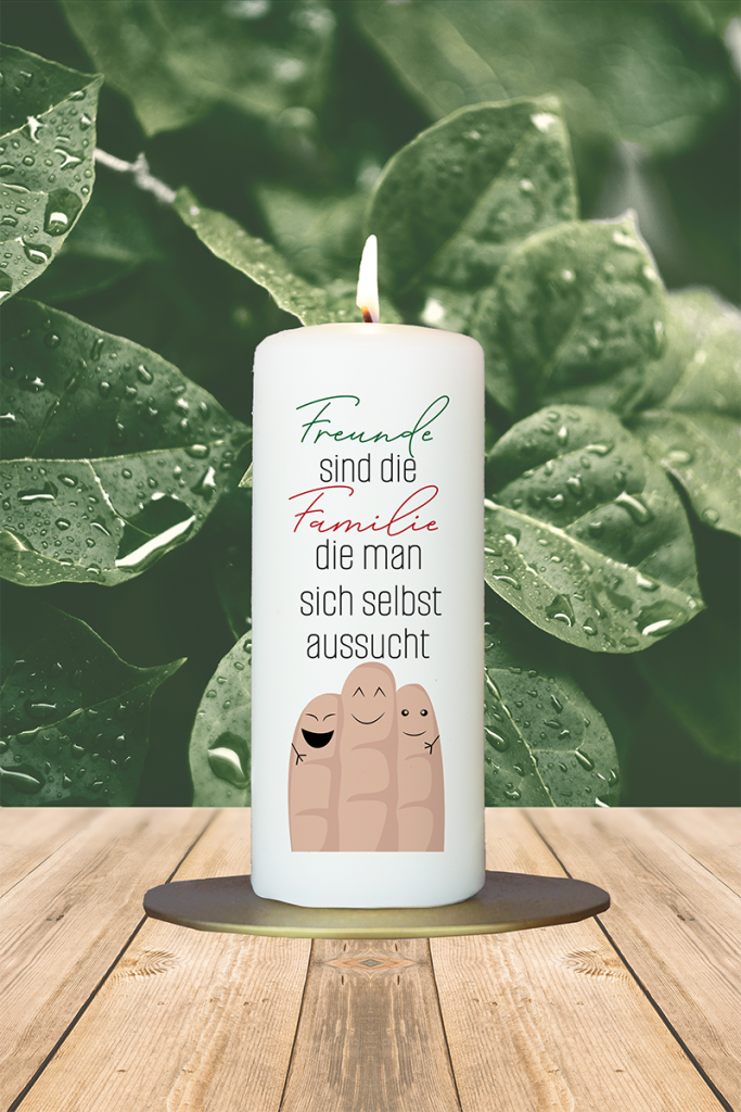 Diese liebevoll illustrierte Kerze zeigt drei Finger mit fröhlich lachenden Gesichtern – ein Symbol für Zusammenhalt, Spaß und echte Freundschaft. Darüber steht die herzliche Botschaft: „Freunde sind die Familie, die man sich selbst aussucht“. Ein wunderbares Geschenk für beste Freundinnen oder Freunde, das zeigt, wie wertvoll diese besondere Verbindung ist. Warm, witzig und von Herzen – perfekt, um einem Lieblingsmenschen einfach mal „Danke“ zu sagen.