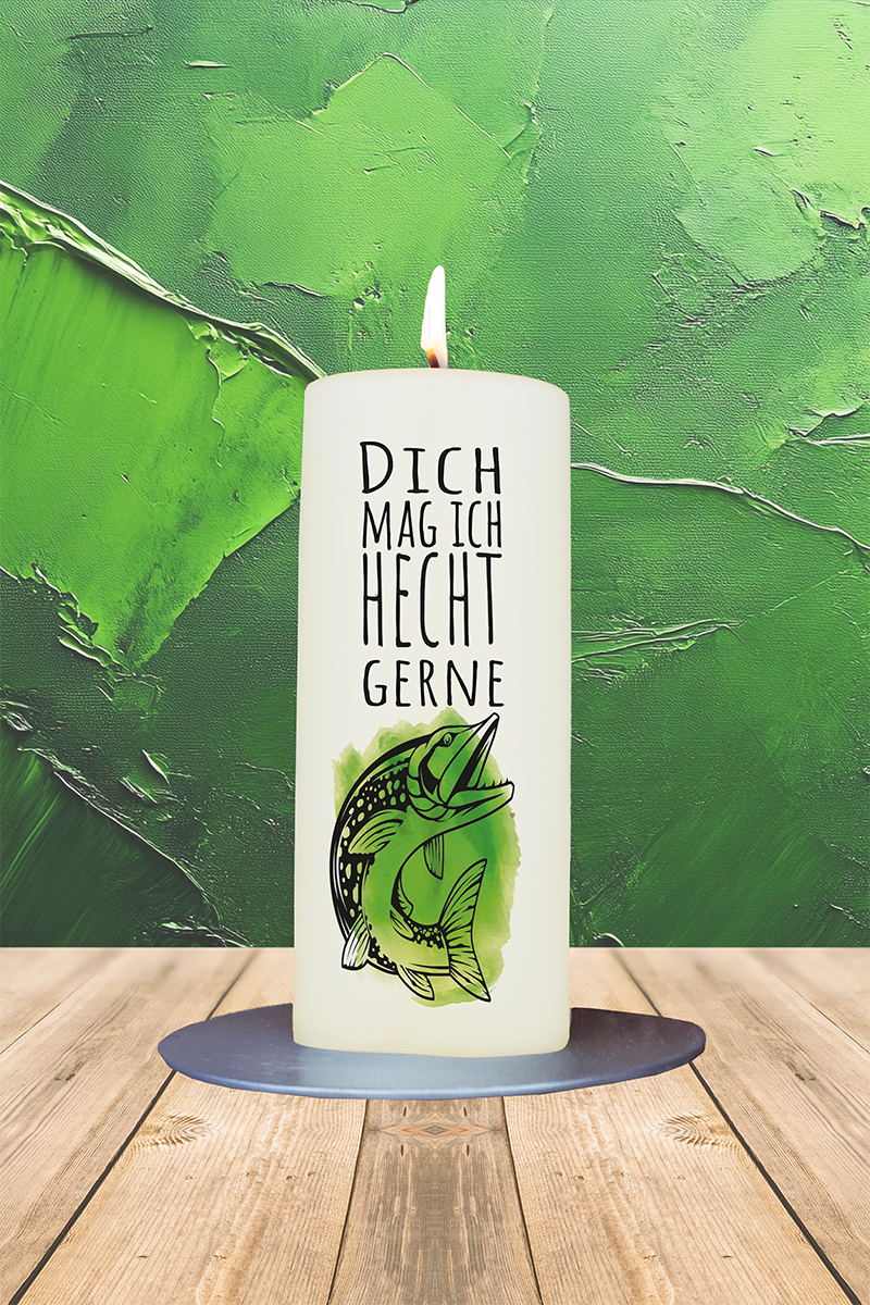 Diese humorvoll gestaltete Kerze bringt garantiert ein Schmunzeln aufs Gesicht: Ein stilisierter Hecht ziert das Design, begleitet von der charmanten Wortspiel-Überschrift „Dich mag ich Hecht gerne“. Ideal als kleine Aufmerksamkeit für besondere Menschen mit Sinn für Humor – ob zum Geburtstag, als Dankeschön oder einfach nur so. Eine originelle Geschenkidee, die zeigt: Du bist mir besonders wichtig – auf hecht-liebevolle Art!
