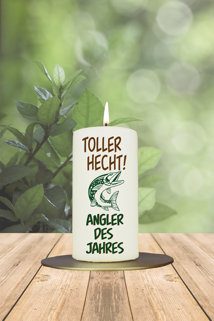 Für alle, die gerne den großen Fang machen! Diese liebevoll gestaltete Kerze zeigt einen imposanten Hecht in stilisierter Darstellung. Darüber prangt stolz der Schriftzug „Toller Hecht“, darunter steht humorvoll „Angler des Jahres“. Das perfekte Geschenk für passionierte Angler, Hobbyfischer oder einfach alle, die sich selbst (oder jemand anderen) mit einem Augenzwinkern feiern wollen. Ideal als kleine Aufmerksamkeit mit persönlichem Charme.