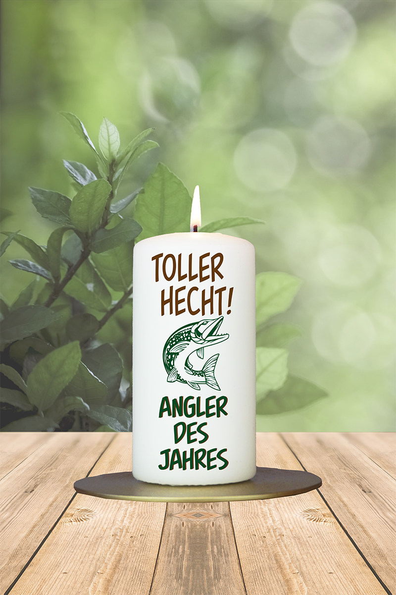 Für alle, die gerne den großen Fang machen! Diese liebevoll gestaltete Kerze zeigt einen imposanten Hecht in stilisierter Darstellung. Darüber prangt stolz der Schriftzug „Toller Hecht“, darunter steht humorvoll „Angler des Jahres“. Das perfekte Geschenk für passionierte Angler, Hobbyfischer oder einfach alle, die sich selbst (oder jemand anderen) mit einem Augenzwinkern feiern wollen. Ideal als kleine Aufmerksamkeit mit persönlichem Charme.