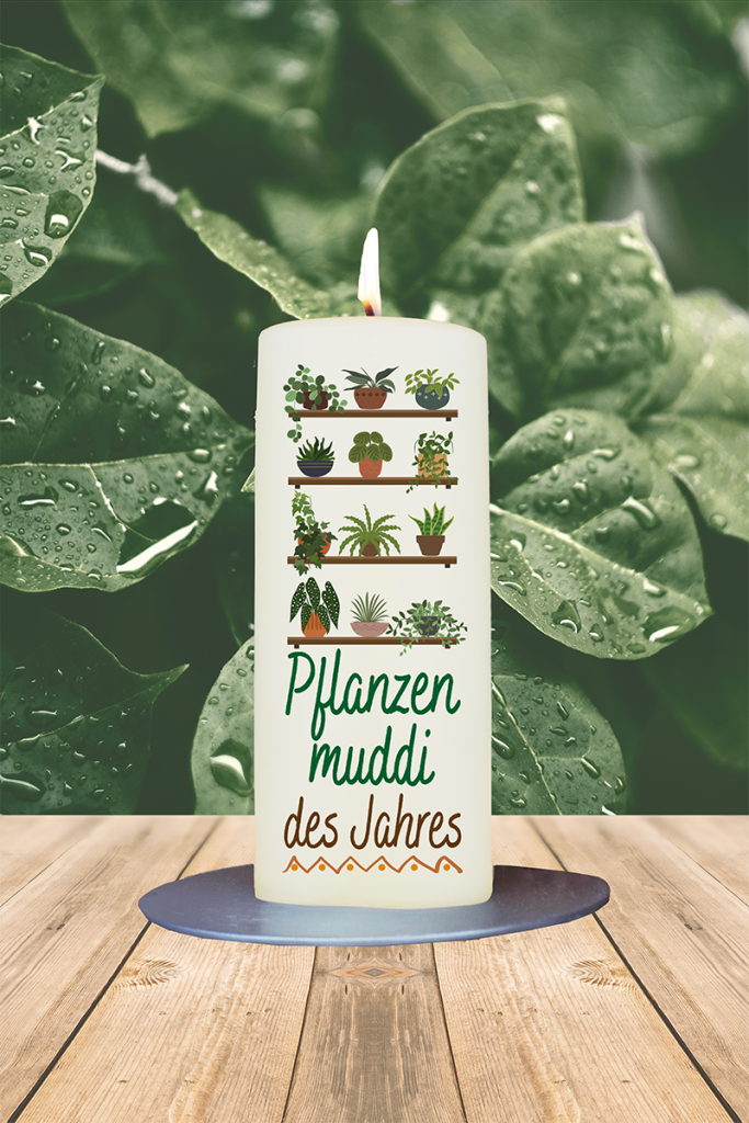 Für alle Pflanzenfreundinnen: Diese Kerze zeigt ein Regal mit stilisierten Pflanzen, das eine frische und lebendige Atmosphäre schafft. Dazu der liebevolle Schriftzug „Pflanzen Muddi des Jahres“ – ein perfektes Geschenk für die Pflanzenliebhaberin, die mit Herz und Hingabe ihre grünen Schätze hegt und pflegt. Ein liebevoller Blickfang für jedes Zuhause und ein tolles Zeichen der Wertschätzung für die grüne Daumen-Expertin!
