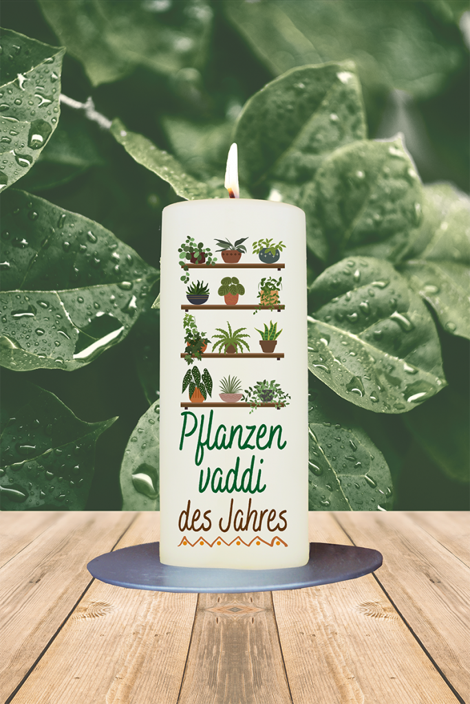Für alle Pflanzenliebhaber: Diese Kerze zeigt ein Regal mit stilisierten Pflanzen, das grüne Wohlfühlatmosphäre versprüht. Dazu der humorvolle Text „Pflanzen Vaddi des Jahres“ – perfekt für den Pflanzenfreund, der mit grünem Daumen und viel Liebe seine grünen Schützlinge pflegt. Ein charmantes Geschenk für Hobbygärtner, das zeigt: Hier lebt der wahre Pflanzenprofi!