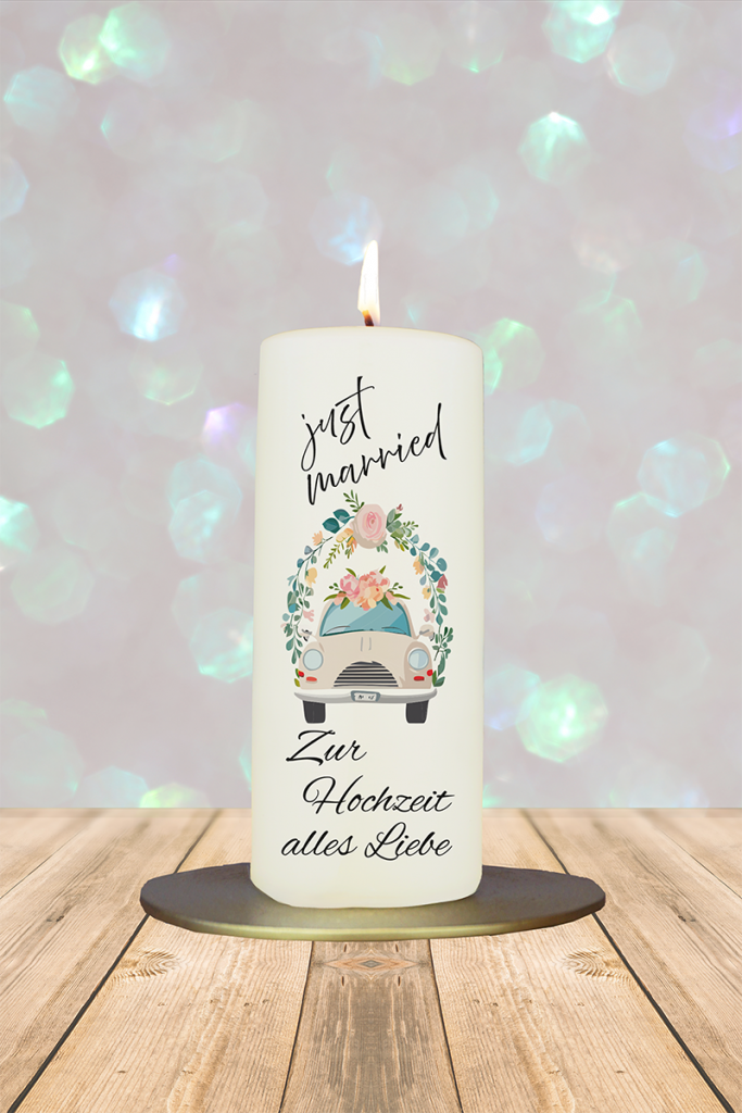 Ein zauberhaftes Motiv, das pure Hochzeitsfreude ausstrahlt: Ein süßes Auto unter einem bunten Blumenbogen, geschmückt mit der fröhlichen Überschrift „Just Married“, steht im Mittelpunkt dieses liebevollen Designs. Darunter der herzliche Wunsch „Zur Hochzeit alles Liebe“ – ideal als Geschenk zur Trauung oder als dekorativer Hingucker auf dem Geschenketisch. Diese Kerze fängt die Leichtigkeit und das Glück eines ganz besonderen Moments stilvoll ein.