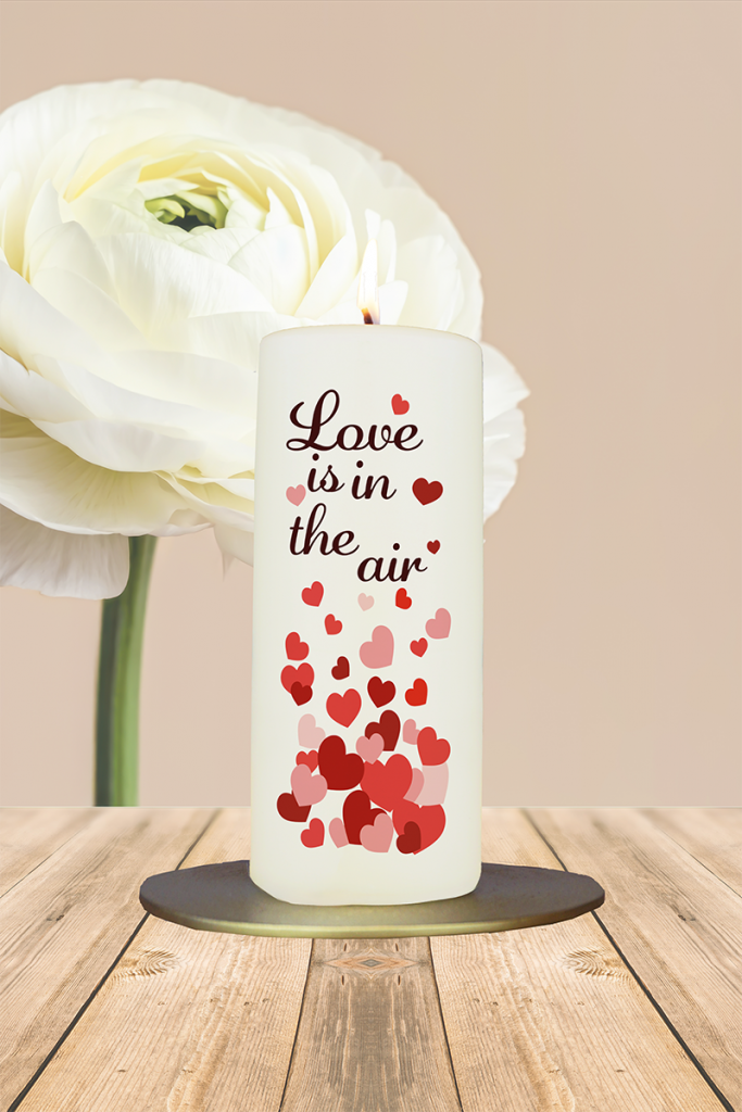 Zahlreiche kleine Herzen in zarten bis kräftigen Rottönen tanzen über die Oberfläche dieser liebevoll gestalteten Kerze und schaffen eine Atmosphäre voller Romantik. Dazwischen steht der verspielte Schriftzug:„Love is in the air“.Eine charmante Geschenkidee zur Hochzeit, Verlobung oder einfach für einen Herzensmenschen – diese Kerze fängt das Gefühl von Liebe auf besonders stimmungsvolle Weise ein und sorgt für ein warmes, emotionales Highlight.